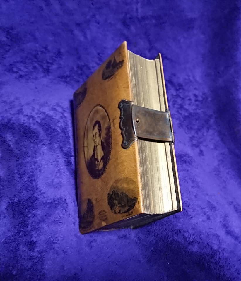 As per the information provided by the seller, this particular book is probably late 19th century with a satin birch wood front and back cover. On the front is markerd; “Made of Wood Grown on the Banks of the Doon.”